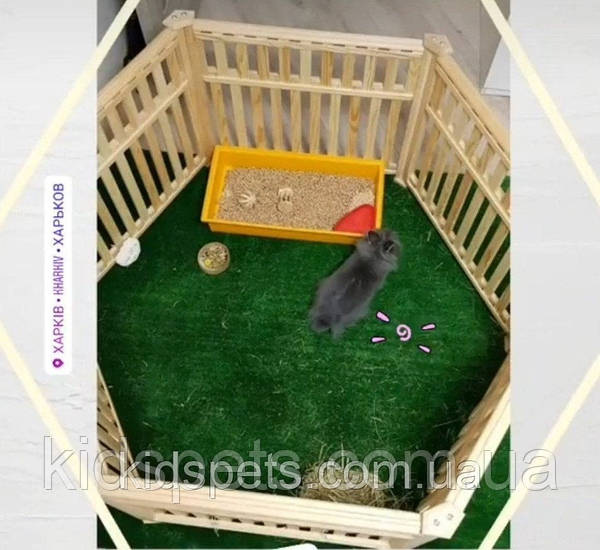 - Вигул: Кроликам необхідно лазити та рухатися, тому будинок для них повинен мати зручний вигул або вольєр. Вигул може бути з’єднаним з будиночком або окремим відділенням. Важливо забезпечити, щоб вигул був безпечним та захищеним від хижаків або небезпечних предметів.