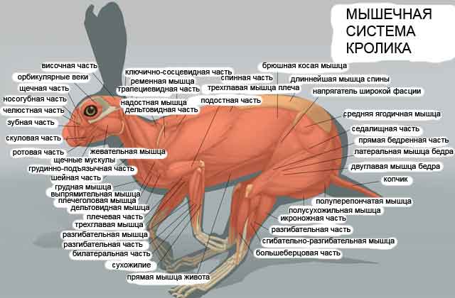 Анатомія кроликів м'ясних порід грубіша, а потужні кістки кінцівок дозволяють утримувати масу, що досягає 12-15 кг. М'язи представлені поперечно-смугастої мускулатурою, а стінки судин – гладкою м'язовою тканиною, що забезпечує прохідність крові і поживних речовин.