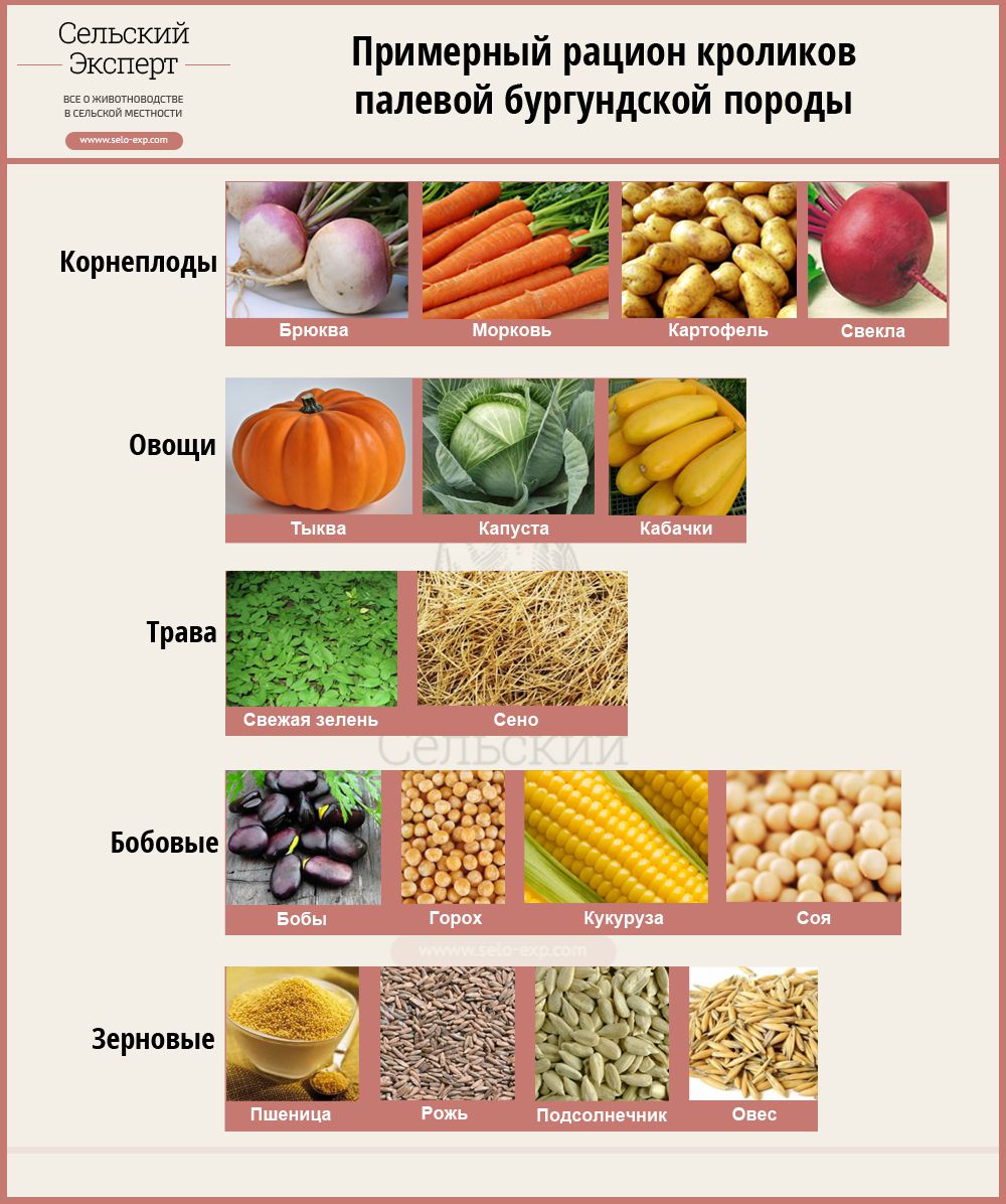 Кролики бургундської породи цілий рік потребують траві. У літні місяці вони з задоволенням поглинають свіжу зелень, взимку – якісне сіно. До траві додають сирі або відварені коренеплоди, а також багаті білком бобові та зернові культури. Не менш важливі рослинні жири і вуглеводи, які тварини отримують з кукурудзи, капусти, коренеплодів, соняшнику і пшона.