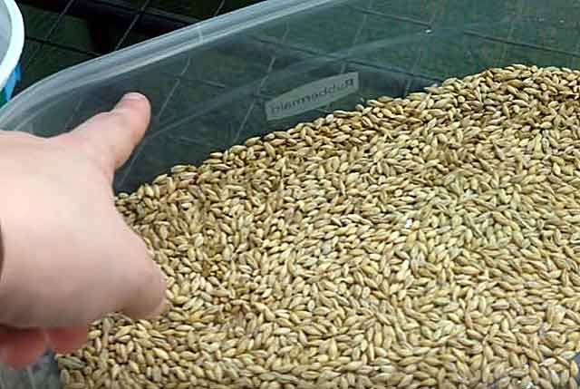 При великому господарстві зерна викладають у великі ємності, заливають водою і залишають на 12 годин. Коли вміст набрякне, його перекладають в целофанові мішки для пророщування (шар 8 см) з отворами для зливу води. Іноді потрібно перетрушувати зерно. Така їжа вводиться поступово, у великих кількостях вона викликає здуття. Якщо під час появи паростків зерно потемніло, то воно не підходить для годування кроликів.