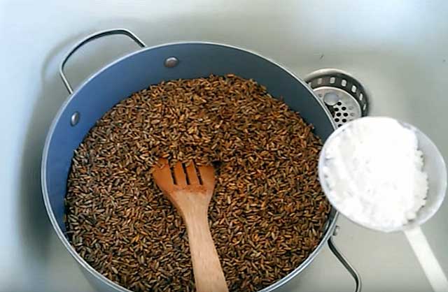 Кроликам набагато простіше їсти запарену їжу. Потрібно взяти один вид злаку або суміш і засипати у відро так, щоб до краю залишалося приблизно 10 см. Після цього заливають окріп і додають 1 ст. ложку солі. Суміш потрібно перемішати, а ємність накрити кришкою. Маса настоюється 5 годин.