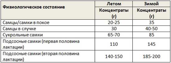 У таблиці показано, скільки повинно бути злаків (концентратів) у раціоні для кроликів різного фізіологічного стану: