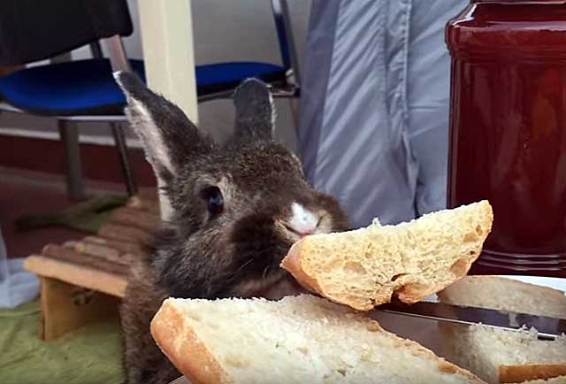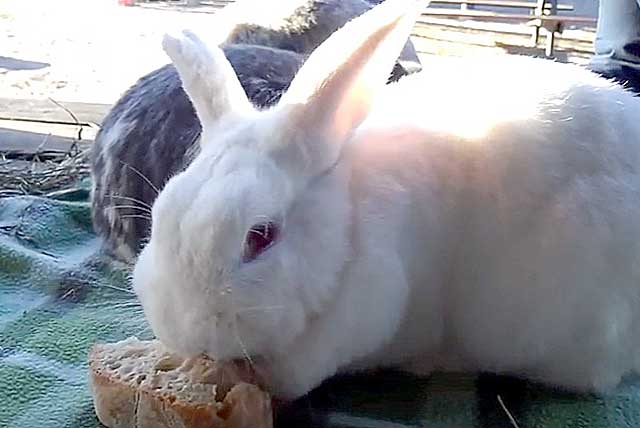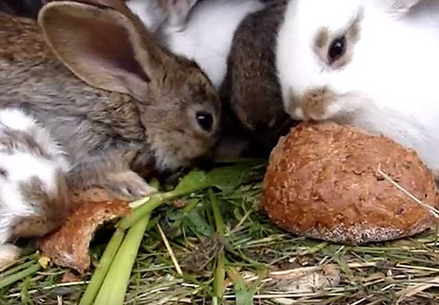Свіжий хліб дають тваринам тільки в невеликих кількостях і вкрай рідко, оскільки він важко перетравлюється шлунково-кишкового тракту кролика. Замість нього можна давати черствий хліб або сухарі.