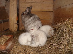 Коли у кролиці в утробі зароджується потомство, вона агресивно реагує на самця. Таким чином ви зможете визначити, що ваші дії дали плоди. Самка здатна народити до восьми кроленят за раз. Виношує дитинчат близько місяця. Народжуються кроленята сліпими і безпорадними, без вовняного покриву.