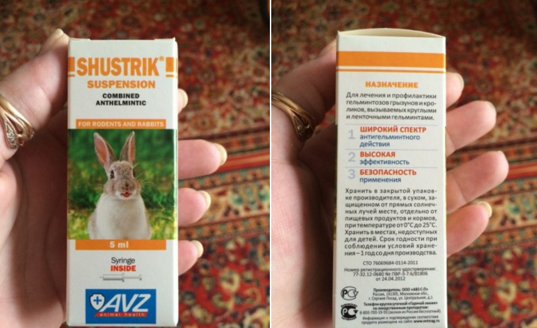 суспензія Шустрик. Препарат є одним з найбільш безпечних за ступенем впливу на організм. Він володіє широким спектром дії, і допомагає ефективно позбутися від різного виду глистів. З лікувальною метою шустрик дають кролям одноразово, підмішуючи в корм, воду або прямо вливаючи в рот кожній тварині, з профілактичною – 1 раз в три місяці. Протипоказаний він тільки при індивідуальній чутливості до діючих компонентів, але вона зустрічається у тварин досить рідко.