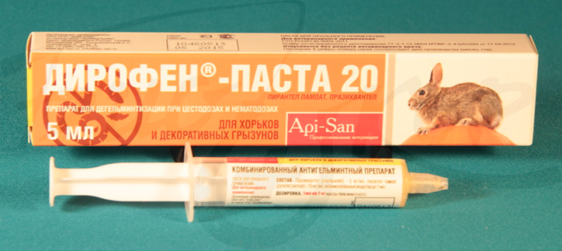 Дірофен-паста. Це комбінований протиглистовий препарат з широким спектром дії. Крім глистогінних властивостей, ліки допомагають прискорити регенерацію пошкоджених паразитами слизових, стимулює імунітет. У складі пасти міститься гарбузова олія – природний компонент з протигельмінтними властивостями. Найбільш ефективно дірофен впливає на стрічкових і круглих черв'яків в різних стадіях розвитку.