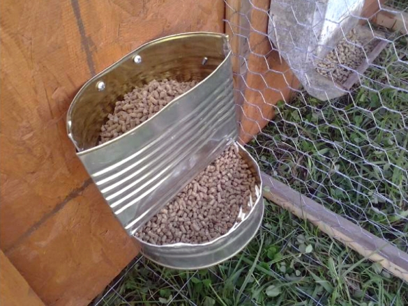 Виготовити таку годівницю своїми руками з підручних матеріалів теж не складе труднощів. Якщо у вашому господарстві завалялася жерстяна банка великого розміру, то можна взяти її в якості вихідного матеріалу і попрацювати над нею в такий спосіб: