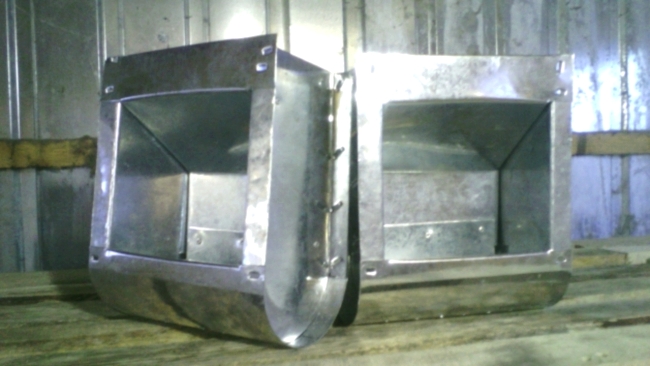 За допомогою рулетки потрібно провести всі необхідні заміри. На щільному картоні накреслити в повному масштабі всі елементи конструкції. Буде зручніше, якщо фрагменти конструкції вирізати з картону, прикласти до металевих листів, обвести за допомогою маркера і потім вирізати ножицями по металу. Скориставшись оправкой і молотком, потрібно зігнути металеві листи в передбачуваних місцях згину, зробивши тим самим кути для годівниці. Всі частини конструкції з'єднати за допомогою заклепочника.