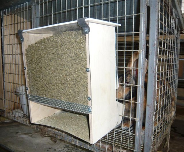 Каркас бункера і годівниць виготовляється з фанери. Металеві куточки кріпляться до тієї частини годівниці, з якої кролики дістають їжу. Це робиться для того, щоб разом з їжею тварини погризли годівницю. Конструкція виходить з двома ємностями для годування і великий бункерній частиною. При бажанні можна в годівницю вбудувати нікельние поїлки. Від цього конструкція тільки виграє.