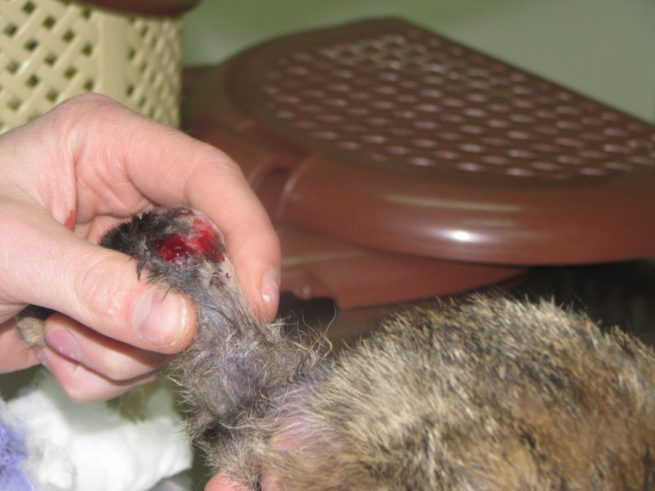Лікування кролика при травмах залежить від виду і ступеня ураження. У разі забиття на пошкоджене місце прикладається холодний компрес. Якщо рана відкрита і почалася кровотеча, його потрібно спочатку зупинити, а потім провести обробку йодом.