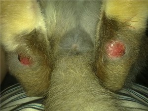 Виникає внаслідок механічного пошкодження подушечок лап. Найчастіше спостерігається у звірків, які проживають в клітинах з гратчастим підлогою, особливо якщо у них недостатньо густе хутро на підошвах.