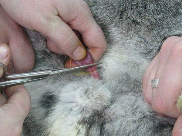 Потім кроляча мошонка з опущеними всередину семенникамі біля основи туго, але не до прориву шкіри, перев'язується лігатурою. Таким чином ви перекриває що йде до сім'яників кровотік. Згодом, приблизно через тиждень яєчка усохнуть і відпадуть.