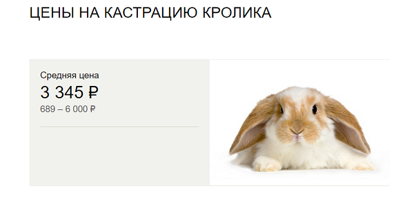 В середньому вартість кастрації кролика по Росії становить від 690 рублів до 6000 рублів. При цьому, потрібно розуміти, що «стрибки» вартості даної процедури можуть спостерігатися навіть у межах одного населеного пункту. У будь-якому випадку, кожна ветеринарна клініка дає попередні консультації, які ви можете отримати абсолютно безкоштовно, і прийняти актуальне для вашої ситуації рішення.