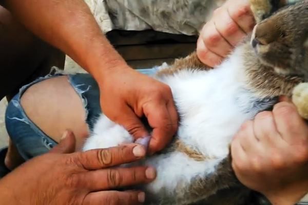 Перевертання кролика в описане положення потрібно для того, щоб яєчка опустилися всередину мошонки, щоб там їх можна було і перев'язати