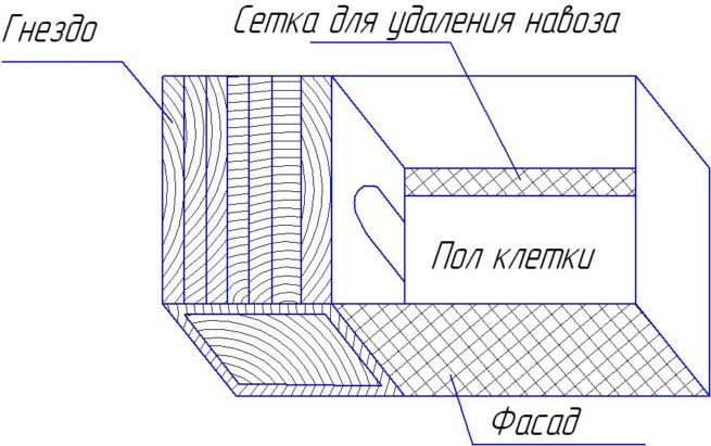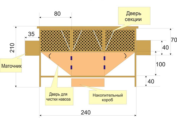 - Пол кожного поверху необхідно зробити під нахилом в п'ять сантиметрів до тильної сторони клітини, для можливості стікання фекалій тварин. Кожен поверх розділяється на дві половини дерев'яними рейками, відстань між ними має бути близько тридцяти сантиметрів, в подальшому тут буде сінник. Стіни конструкції виконуються з дерев'яних дощок. Кожен поверх на половину покривається дошкою або шифером, отриманий зазор закривають дрібною сіткою.