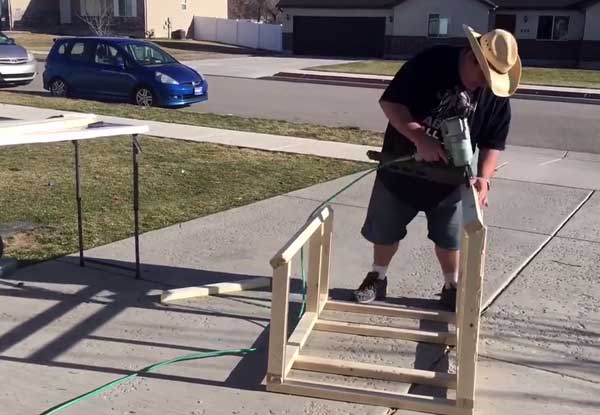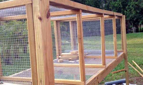 Обробляємо куточки дерев'яними брусками і ставимо каркас на стійку. Прямокутник в підставі клітини робимо з латами в 5 брусків. Кріпимо до куточка поперечки. Каркас можна створити з металевих труб, тоді знадобиться зварювання.
