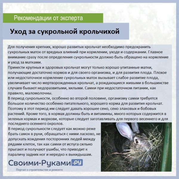 Якщо кролиця здорова і спокійна, вона здійснює догляд за дитинчатами в повній мірі. Кролівник повинен стежити за станом клітини, наявністю необхідного раціону їжі і води, а також станом дитинчат.