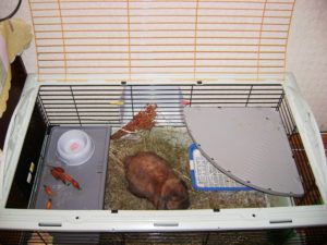 Для розташування клітини потрібно вибрати місце, надійно захищене від холоду і протягів – це убезпечить кролика від застуд. Бажано розташувати житло на незначній височини – наприклад, на невисокому подіумі або звичайному журнальному столику, щоб звір мав можливість спостерігати за тим, що відбувається навколо, не побоюючись висоти. Крім того, місце з кліткою має бути добре освітленим і тихим. Поблизу не повинні розташовуватися телевізори або музичні стерео-системи.