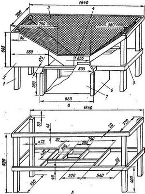 - Під каркасом розміщують відсік для посліду, який роблять з оцинкованого заліза. Для цього проводять завмер металу і вирізують ножицями лист відповідних розмірів. Контейнер для посліду роблять у формі перевернутої піраміди і розміщують внизу, між двома відсіками для постійного перебування кроликів. Таким чином, на 2 клітини нижнього ярусу і 2 клітини верхнього ярусу можна зробити один відсік для посліду.