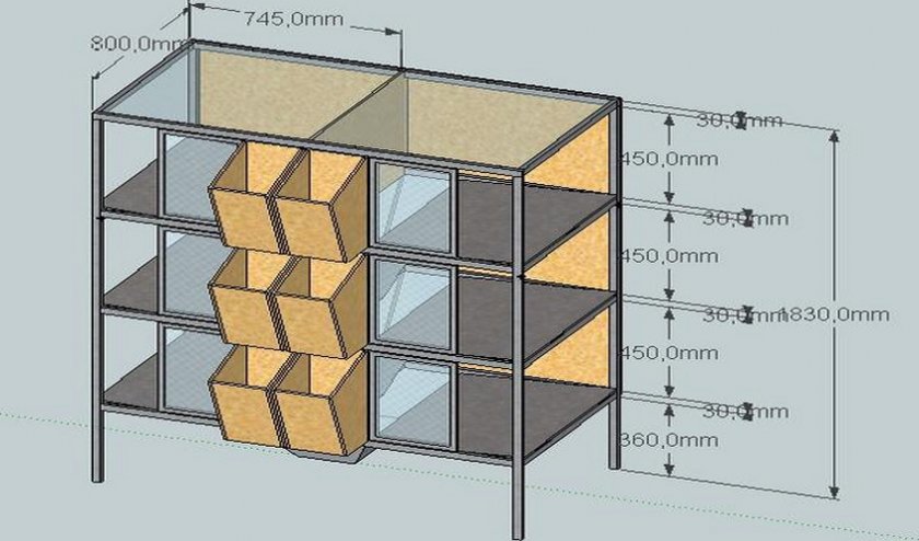 Міні-ферму встановлюють таким чином, щоб задня стінка була розташована на північ, а передня – на південь. Один клітинний відсік повинен мати такі розміри: висота – 50 см, ширина – 70 см, довжина – 150 см.