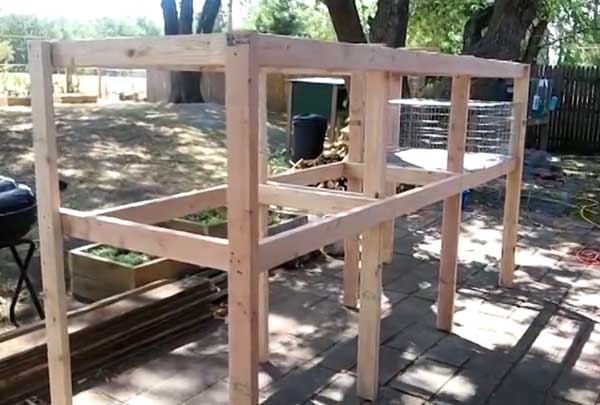 Будівництво треба починати з надійною стійкою підставки, яку краще виготовляти з особливо міцних матеріалів. Чотири бруска слід скріпити вертикально між собою, а під підставкою розташувати пірамідальну шахту для відводу кролячих випорожнень, яка закінчується ємністю для їх збору. Підстава обшити фанерою або ДВП.