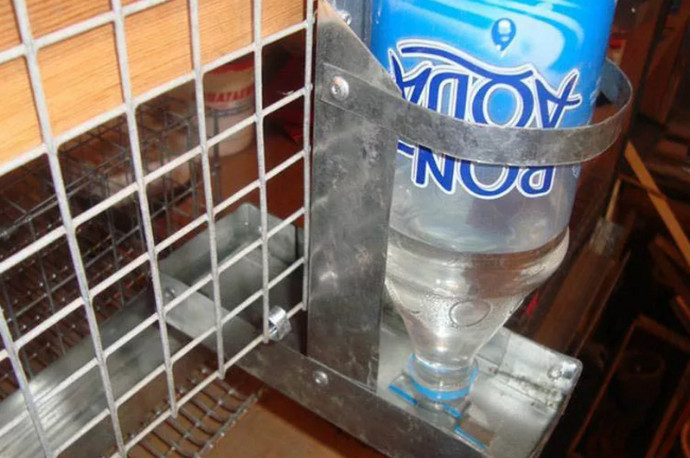 Елементарна ємність для водопостачання кролика закріплюється на клетухе за допомогою двох шматків дроту, вона не повинна бути занадто жорсткою. Одним кінцем прихоплюється горловина бутлі, за допомогою другого тримається верхня частина. Проста конструкція може бути застосована на невеликих господарствах.