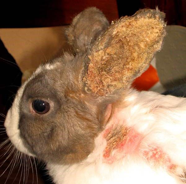 - скупчення ексудату призводить до інтенсивного утворення кірок, які на запущених стадіях наглухо перекривають слуховий прохід кролика;