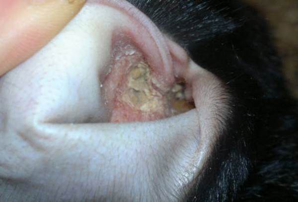 - внутрішня поверхня вушної раковини змінює свій колір з ніжно-рожевого на нездорово-червоний. Зміна кольору відбувається тому, що в результаті діяльності кліщів поверхню шкіри запалюється. При легкій формі такі запалення мають точковий характер;