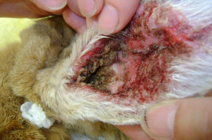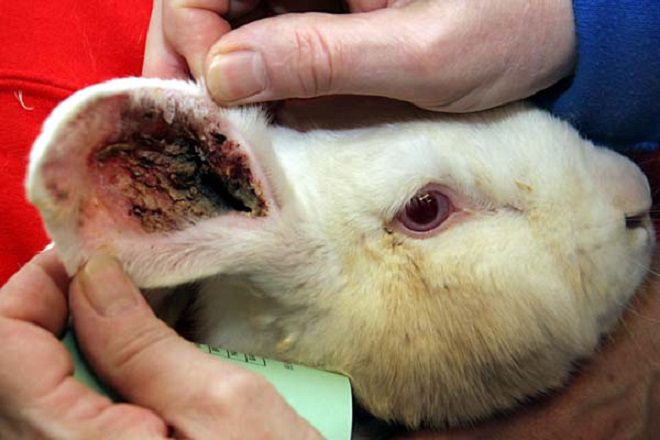 Кірка утворюється на вухах кроликів в результаті виділення кліщами токсинів