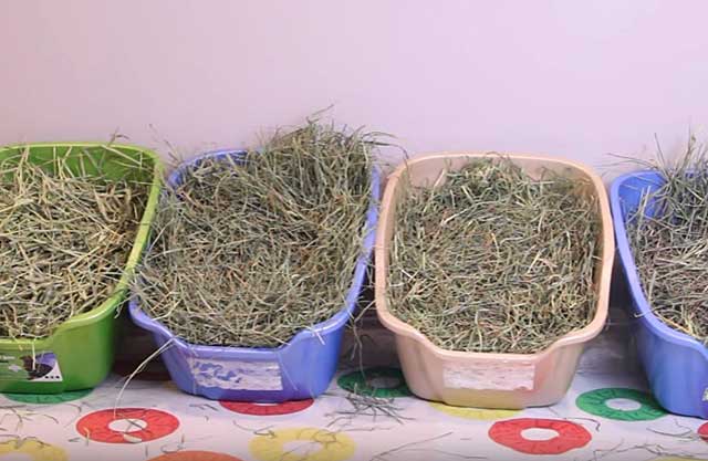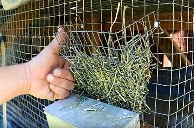 Якщо в клітинах відсутні спеціальні годівниці, то витрата грубих кормів по днях буде ще вище. Частина сіна буде розтоптана тваринами, а іншу кролик може використовувати для побудови індивідуального гнізда.