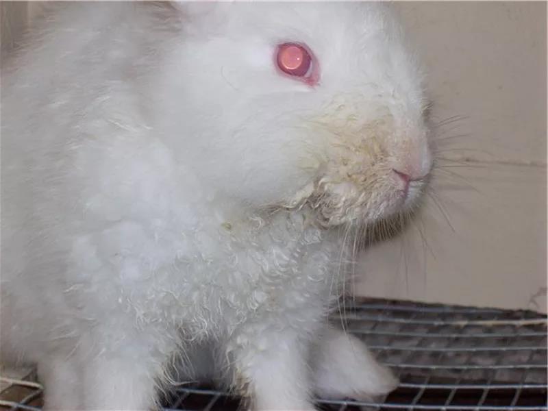 Крок 2. У нормальному стані у кролів повинні бути ясні очі без почервоніння, гнійних виділень. Звернути увагу слід на ніс – він повинен бути сухим і рухомим.