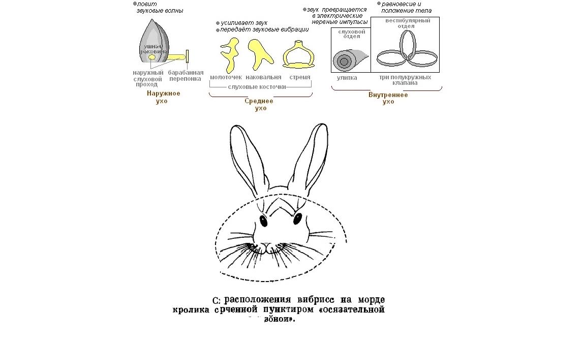 - Дотик (тактильне сприйняття). Чутливість спостерігається у кроликів в області шкіри очей, тімені, рота і спини.Тварини реагують на біль, температуру, орієнтуються в просторі.