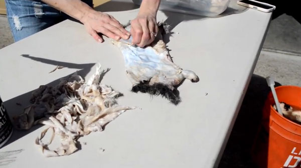 Починати слід з вух, потім переходити на очі, використовуючи добре наточеними ніж. Знявши шкуру, потрібно її просушити протягом години, а потім видалити залишки жиру, сухожиль і м'язи.
