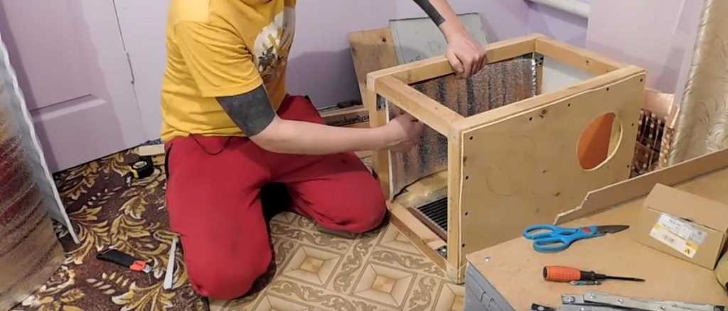 Крок 5. Нагрівач встановлюється в нижній частині маточника в «кишеню», під фанеру. До нагрівача необхідно припаяти дроти, які будуть виходити знизу через отвір в маточнику. Внутрішні стінки теж потрібно утеплити фольгированним изолоном і фанерою.