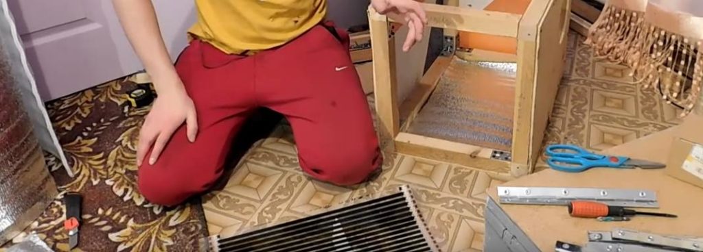 Крок 4. Тепер необхідно зробити в маточнику тепла підлога. Нижнім шаром на підлогу укладається спеціальний фольгований ізолон, а потім вже система нагрівання. Між нагрівачем і нижньої дошкою підлоги повинно залишатися простір, тому вниз слід закріпити 2 рейки.